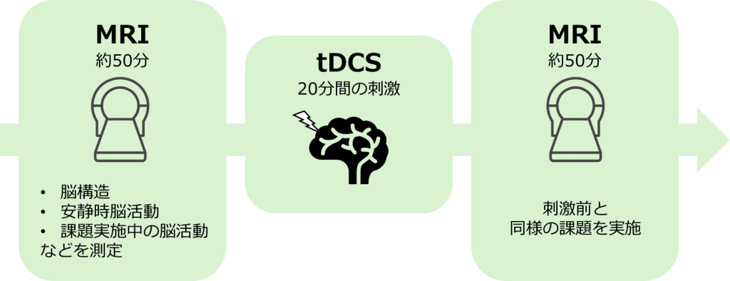 京都大学医学部附属病院へお越しいただき、頭部MRI検査、経頭蓋直流電気刺激(tDCS)心理検査をお受けいただきます。MRI検査は、脳刺激の前後で行い、合計2時間程度かかります(上図を参照)。心理検査のうち、一部はMRI検査を行う日に実施し、残りはご自宅で受けていただきます。1回来院あたり3時間半~4時間ほどお時間を頂戴する予定です。効果のある刺激(実刺激)と効果のない刺激(シャム刺激)の2種類をお受けいただくため、合計2回来院いただきます。刺激中、どちらの刺激条件で受けているのかは、担当する検査者も参加者もわからない状態で行います(二重盲検)。